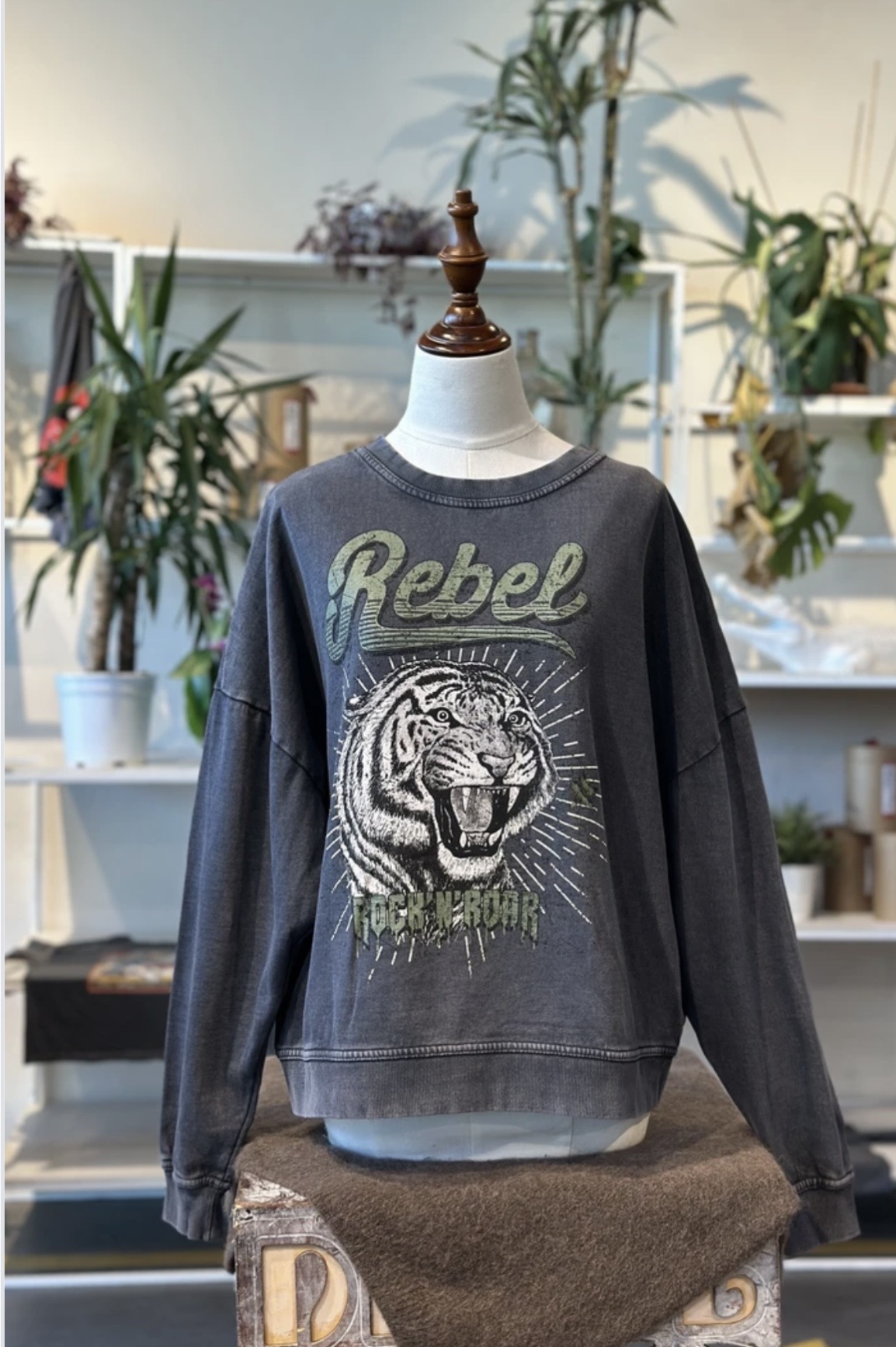 Een stoere, vintage-washed sweater met attitude. Het opvallende tijgerdesign gecombineerd met de bold teksten "Rebel" en "Rock 'n Roar" maakt dit een echte statement piece. De charcoal kleur met washed effect geeft de trui een authentieke, gedragen look die helemaal past binnen de huidige streetstyle trends.