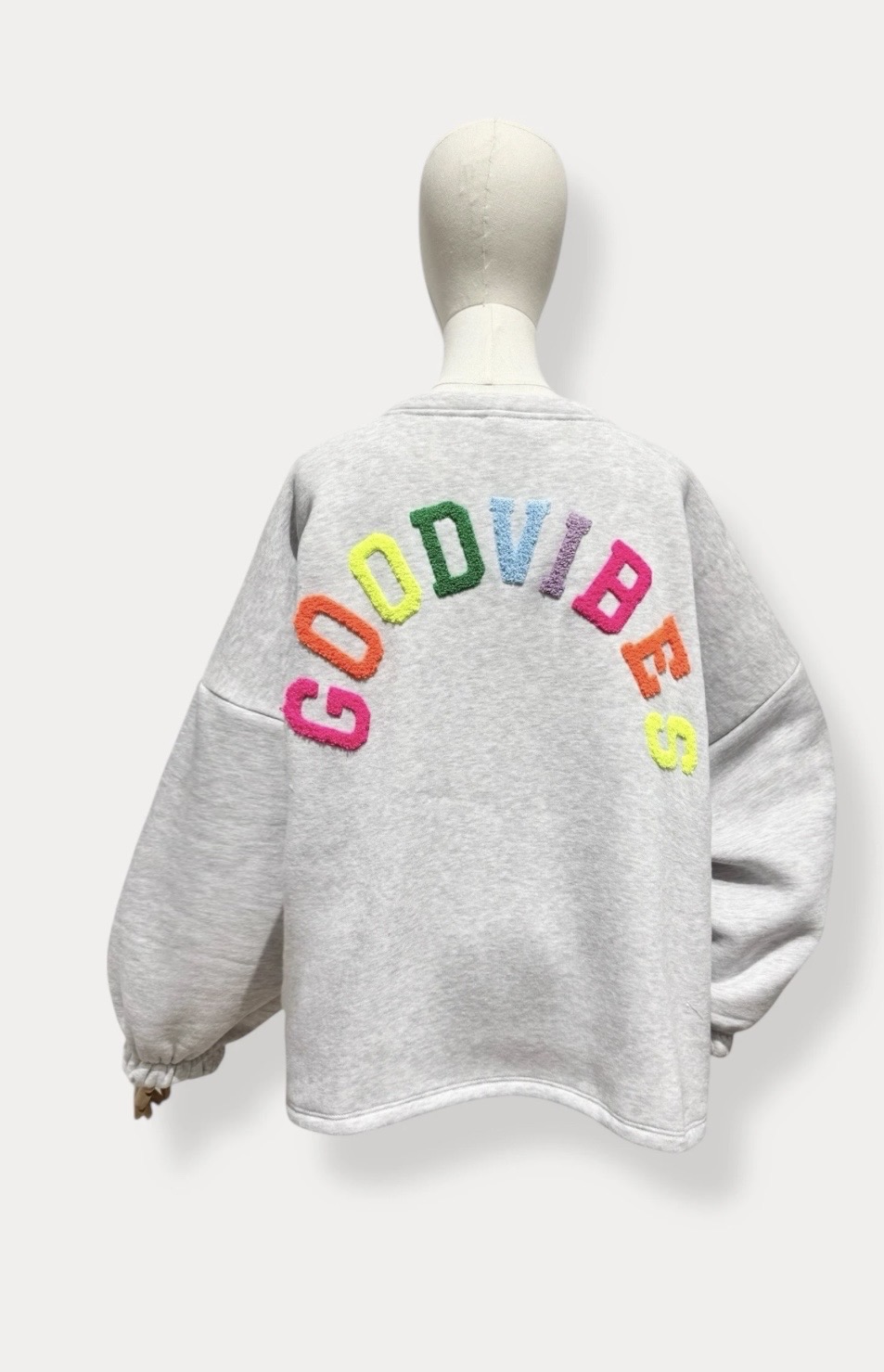 Instant happy vibe. Deze oversized sweater in grijs krijgt een speelse twist door de kleurrijke "GOOD VIBES" print op de rug — subtiel van voren, een echte eye-catcher van achter.