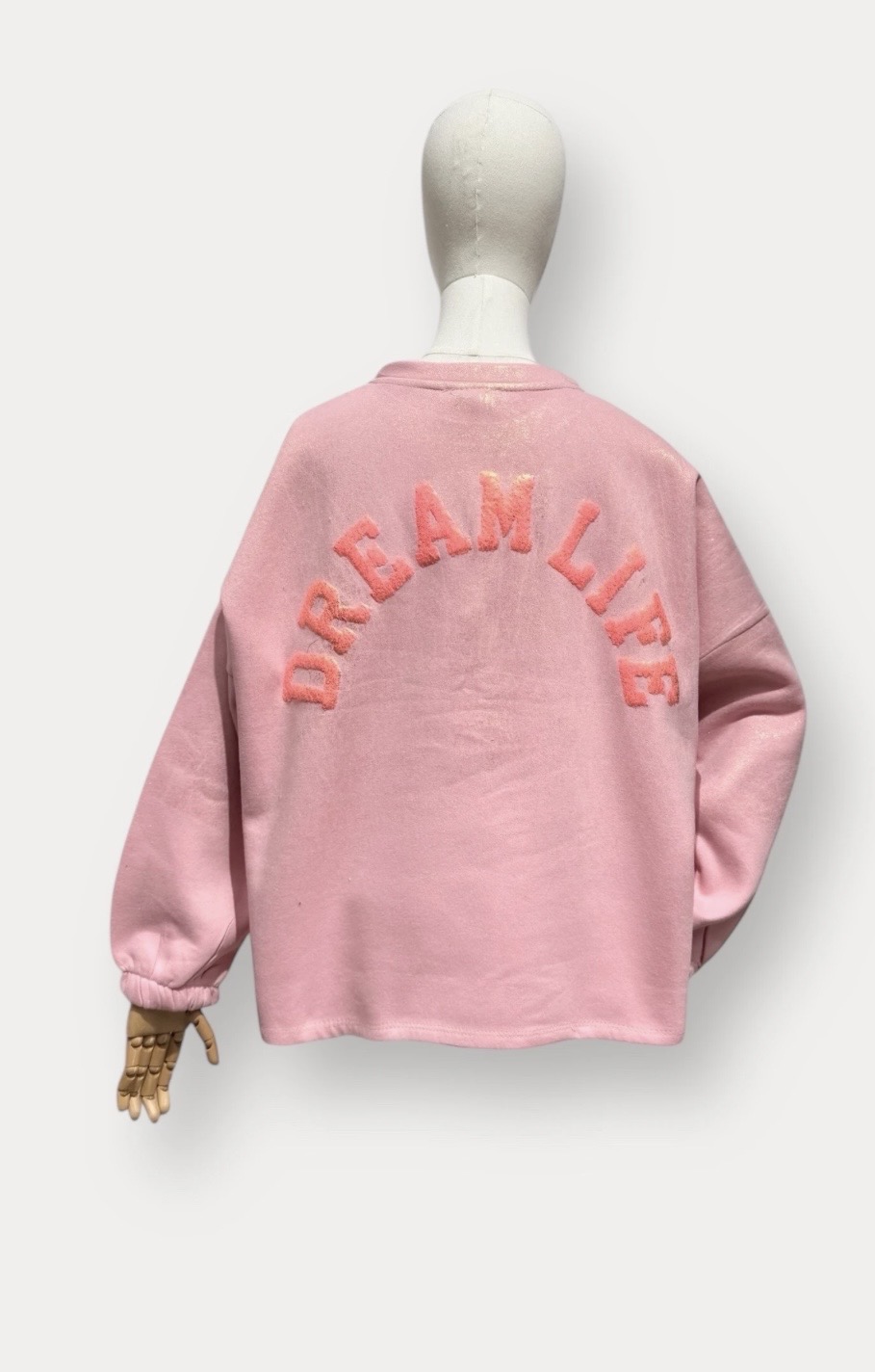 Zacht, speels en toch opvallend. Deze oversized sweater in roze krijgt een unieke twist door de subtiele metallic finish en de "DREAM LIFE" print op de rug.