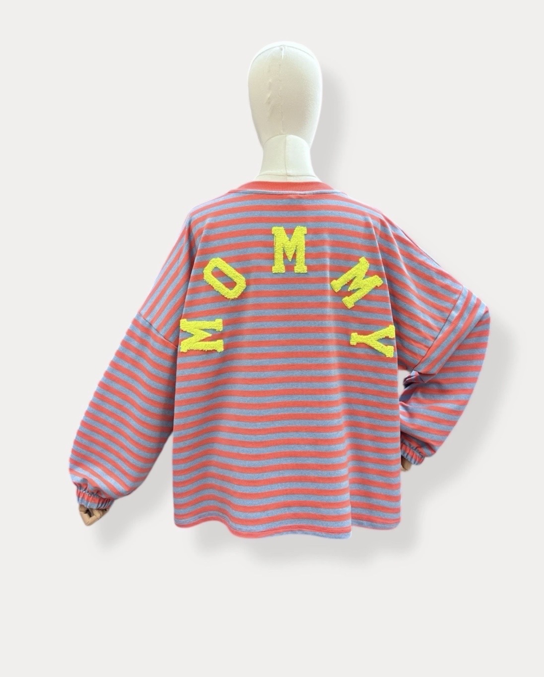 Statement piece met attitude. Deze oversized sweater combineert speelse strepen met een opvallende "MOMMY" print op de rug — een echte eye-catcher van zodra je je omdraait.